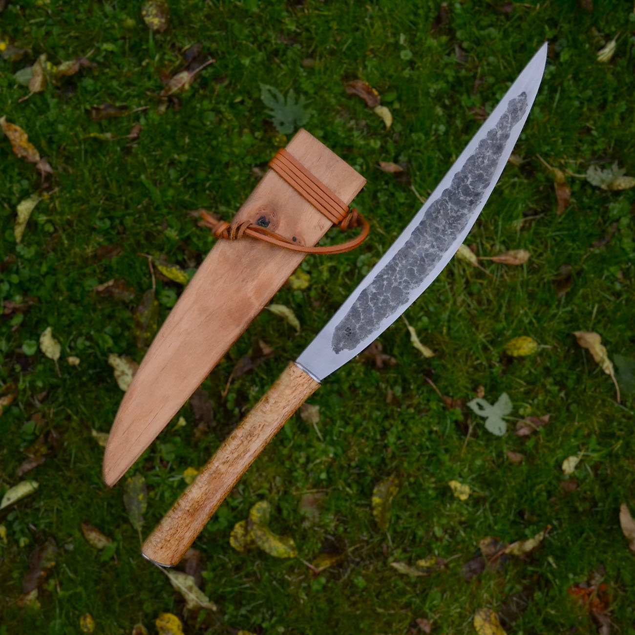 The scabbard was created from birch and has a leather strap to secure the tool to the belt.
