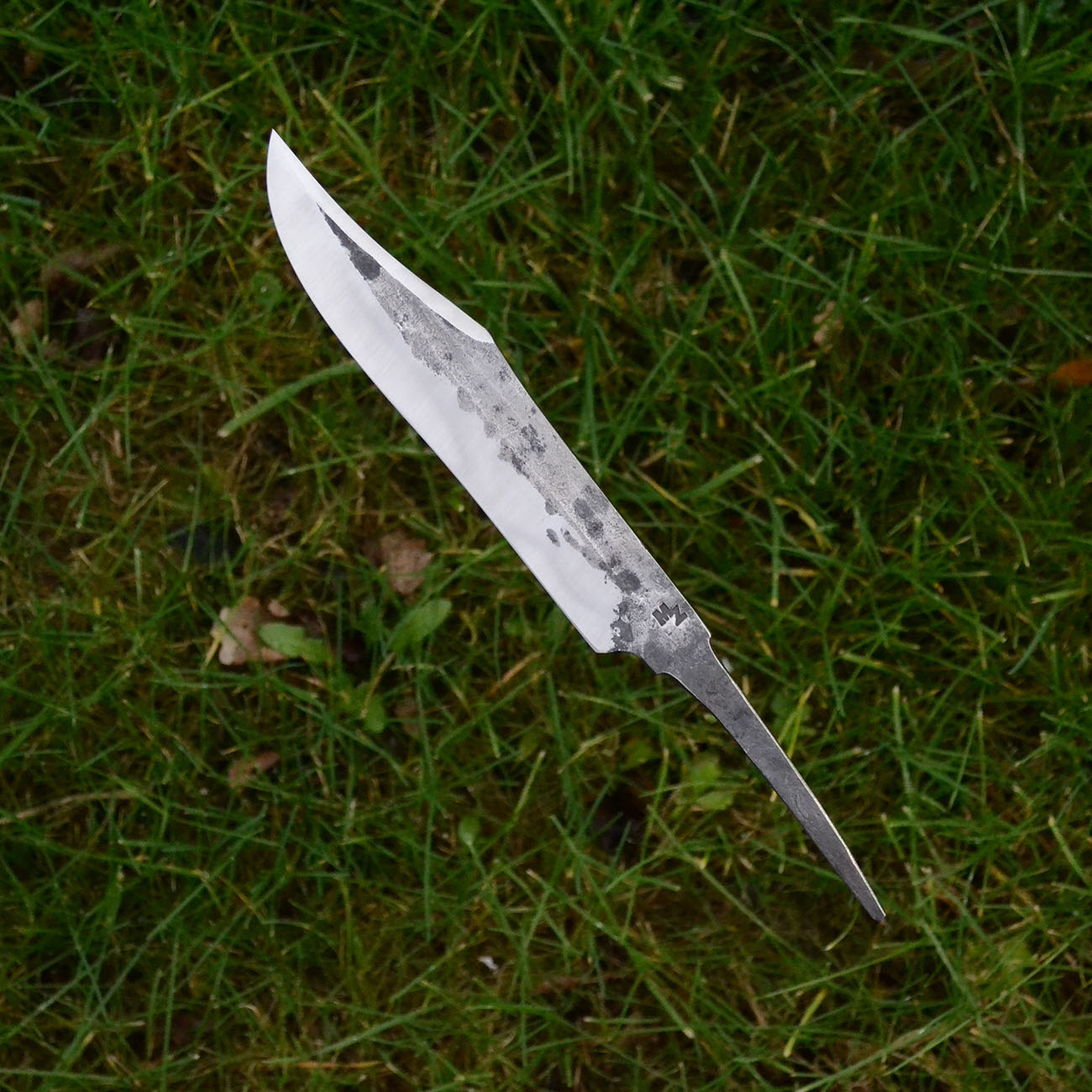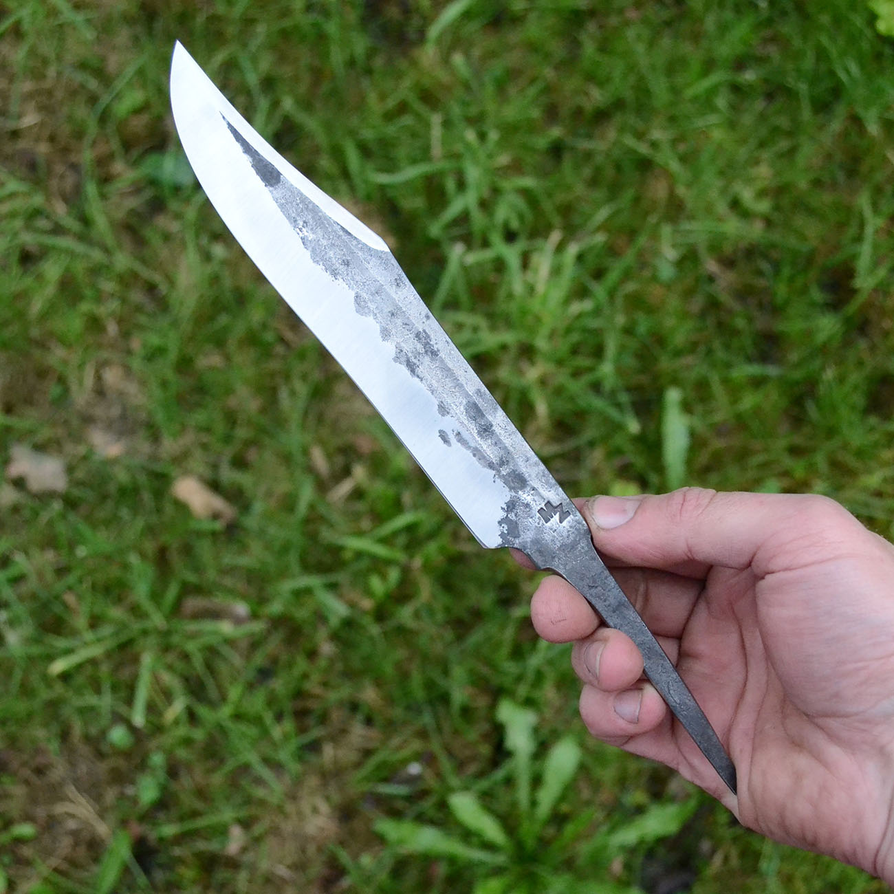 Klinga (blank,ostrze) noża w stylu bowie wykutego ze stali łożyskowej ŁH15. Kute zbrocze oraz fałszywe ostrze.