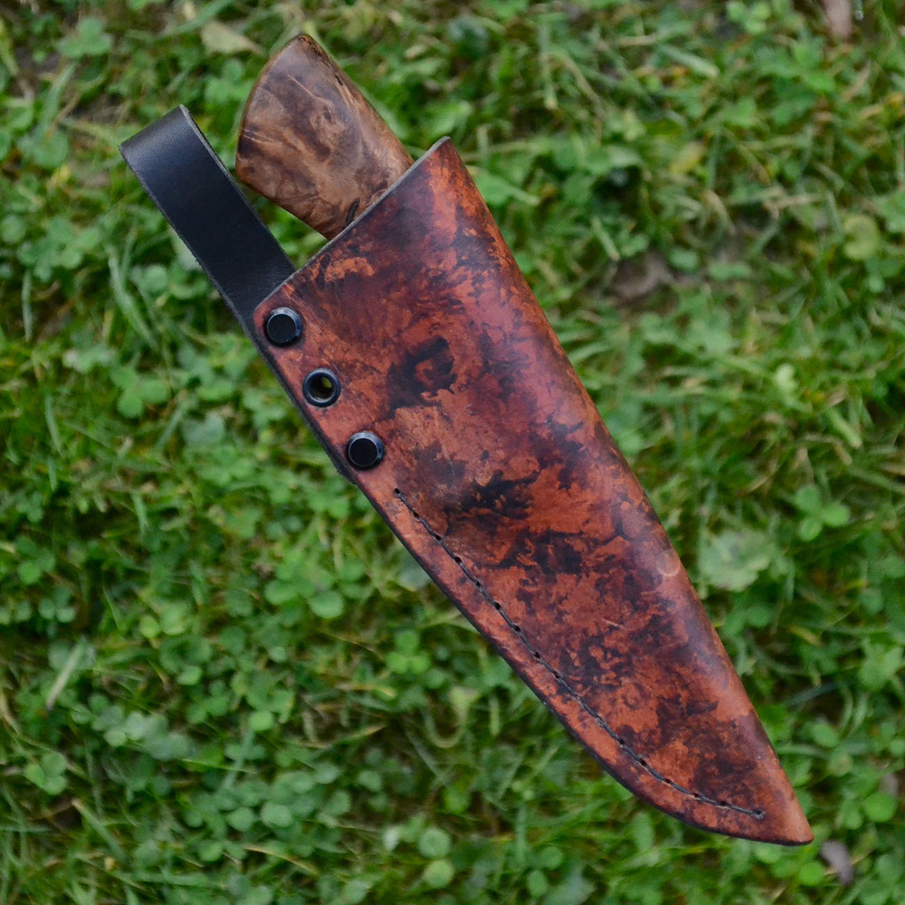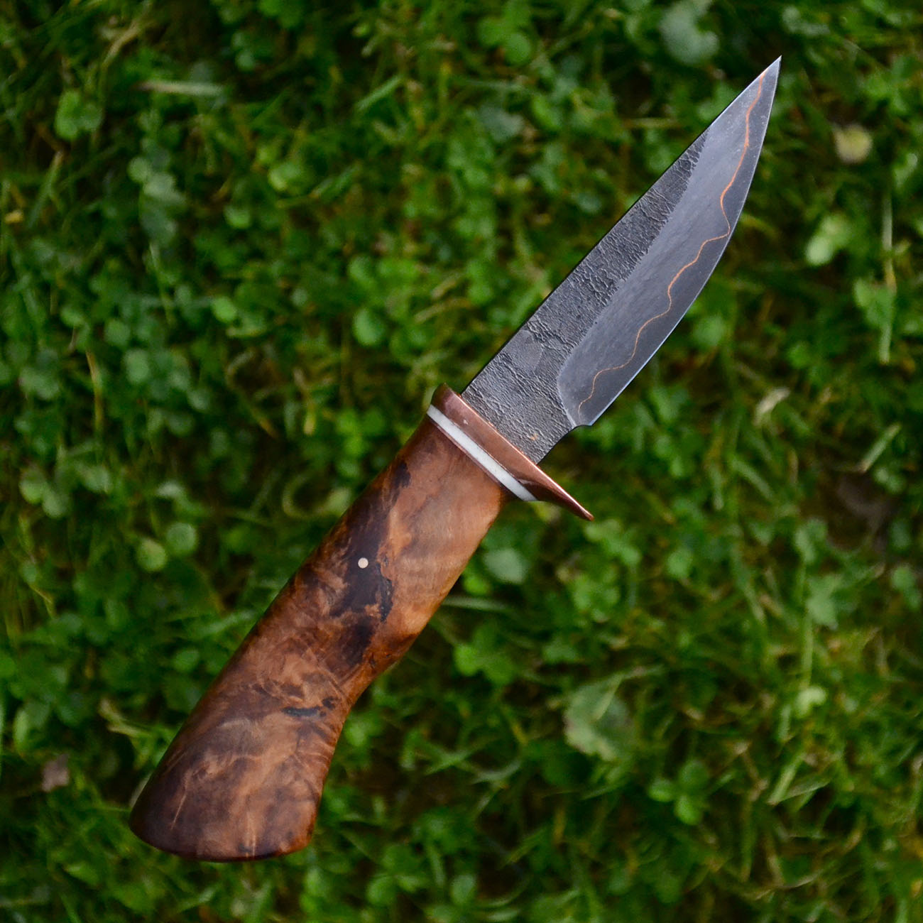 Jelec powstał z miedzi. Rękojeść to piękna czeczota olchy stabilizowana żywicą z przekładkami z kości i miedzi.